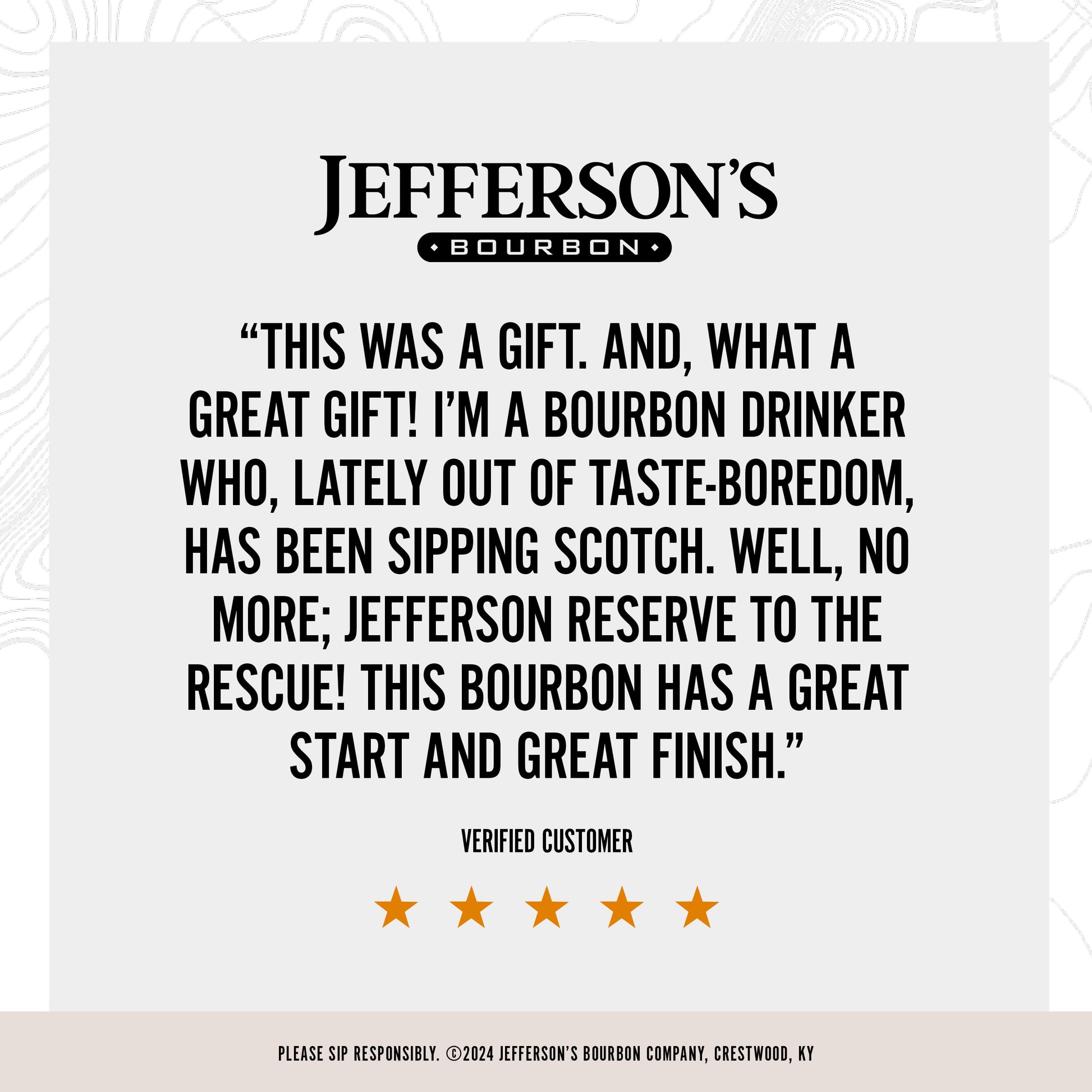 Jefferson’s Reserve Bourbon Whiskey is the oldest and most robust bourbon whiskey in the core Jefferson’s family and a perfect example of the artistry of blending. This blend of mature bourbons exhibits incredible nuance and complexity of flavors that only a masterful blender can unlock. The end result is a big, sophisticated bourbon whiskey with a bold, substantial palate. Aged in oak barrels, this whiskey features notes of caramel, sweet toffee and cinnamon with aromas of sweet honey and sumptuous nutmeg and a long, delicious finish of leather and tobacco. It’s robust enough to satisfy even the most discerning bourbon snob and smooth enough for the whiskey novice. Enjoy this liquor neat, on the rocks in a whiskey glass or in classic cocktails and alcohol drinks like a Whiskey Sour, Old Fashioned or Manhattan with orange bitters and sweet vermouth. Enjoy Responsibly.